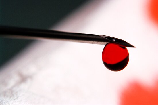 Drop of blood at the end of a syringe. Photographer  Sami Sarkis